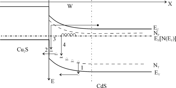 3.двухступенчатое туннелирование электрона из квазинейтральной области CdS в ОПЗ (переход 3) и последующей рекомбинации с неравновесной дыркой;
