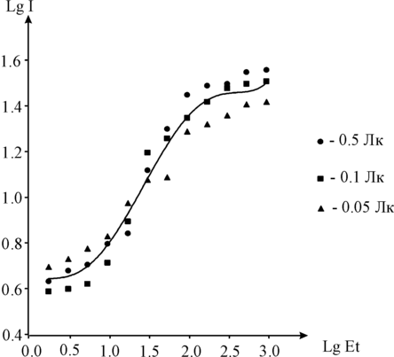 Для подтверждения применимости данного метода были измерены характеристические кривые при интенсивностях возбуждающего света: 0,05 лк, 0,1 лк, 0,5 лк. Как видно из рис.12, семейство кривых достаточно хорошо повторяет один и тот же профиль. Это говорит о том, что образец обладает свойством интегральности и по отношению к нему применимо понятие экспозиции. Из усредненной характеристической кривой (рис.12) были определены основные сенситометрические характеристики ФСИ на основе гетероперехода CdS-Cu2S. К ним относятся: коэффициент контрастности , равный тангенсу угла наклона прямолинейного участка, который оказался равным =0.55, фоточувствительность S, определяемая в единицах ГОСТа и оказавшаяся равной примерно 16 ед. ГОСТа.