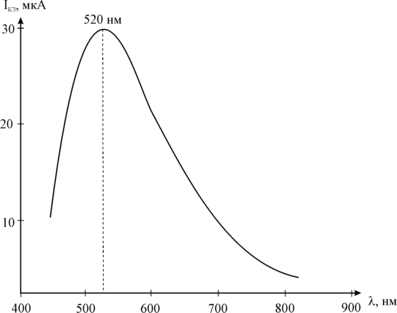 Спектральное распределение тока короткого замыкания позволяет охарактеризовать формирователь сигналов изображения на основе гетероперехода CdS-Cu2S как зеленочувствительный по общепринятой классификации для фотографических слоев. Следовательно, запись оптической информации наиболее эффективна при длинах волн около 520 нм.