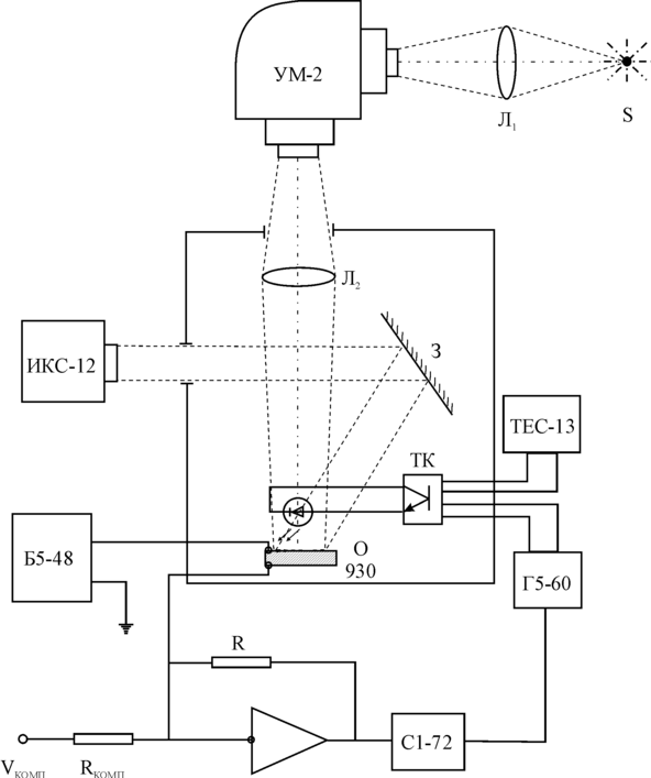 Монохроматор УМ-2 использовался, в основном, для измерения спектральных зависимостей тока короткого замыкания и сенситометрических характеристик образцов. Свет от лампы S, яркость которой регулировалась через линзу Л1, направлялся на входную щель монохроматора. С входной щели свет фокусировался линзой Л2 и направлялся на исследуемый образец. Зеркало З установлено таким образом, чтобы свет от ИК - монохроматора попадал на ту же часть образца, что и свет от монохроматора УМ-2.