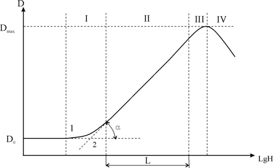Если облучить слой светом любого спектрального состава серией возрастающих экспозиций и по данным измерения проявленных почернений построить зависимость оптической плотности D от логарифма количества освещения lgH , то полученная кривая, называемая характеристической, будет иметь S - образную форму, где различают следующие области (Рис. 9):