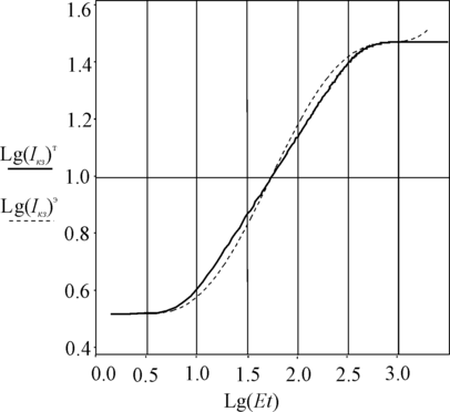 Выражение (30), просчитанное и представленное в координатах Lg(Iкз) от Lg(Et), является теоретической моделью характеристической кривой ФСИ на основе гетероперехода CdS-Cu2S. Расчет был произведен программой MathCAD, а полученная в результате кривая представлена на рисунке 13. Также для сравнения дана усредненная экспериментальная кривая, которая была уже представлена на рис.12.