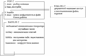 Головной модуль pgp.c обеспечивает интерфейс системы с пользователем и взаимодействие ее компонентов. Входящая в него функция main() производит разбор командной строки, через которую пользователь указывает команду. В соответствии с командой main() производит последовательный вызов необходимых подпрограмм, обеспечивая их согласованную работу.