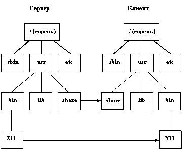 На рисунке 1 приведен пример, в котором два подкаталога удаленной файловой системы-сервера (share и X11) монтируются к двум (пустым) каталогам файловой системы-клиента.