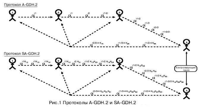 Однако SA-GDH.2 имеет более высокую «вычислительную стоимость» по сравнению с A-GDH.2. Прежде всего, он требует (n-1) экспоненцирование для каждого Mi (кроме первого), в отличие от i экспоненцирований в A-GDH.2. К этому еще добавляется работа по формированию общих ключей для каждой пары абонентов (если они не вычислены заранее): на последнем этапе проводится одно экспоненцирование – как и в A-GDH.2. На рис. 1 приведены примеры протоколов A-GDH.2 и SA-GDH.2.