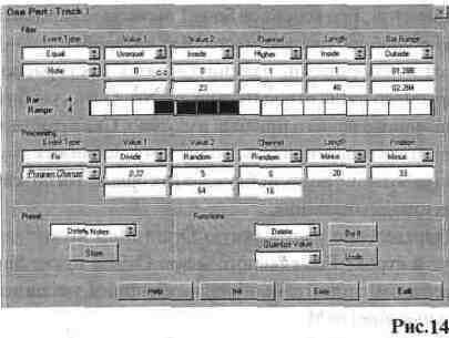 Random - существующее значение подменяется числами, выбранными программой наобум. Причем это делается в диапазоне, сформированном значениями во второй и третьей колонках Vail. Так, если вы во втором окошке поставили число 36 (С1), а в третьем 48 (С2), то программа будет выбирать наобум в пределах именно этой октавы.