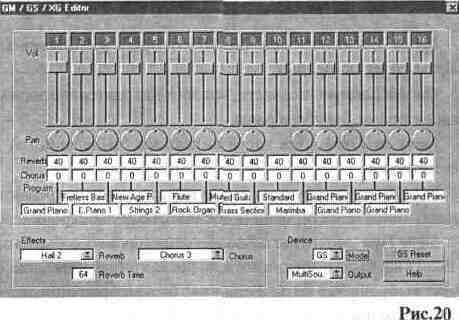 Вертикальные ползунки регулируют громкость каждого MIDI канала. Круглые потенциометры под ними - панораму. В окошках Reverb и Chorus вы можете регулировать величину подмешивания ре-верберированного и обработанного хорусом сигналов (при условии, что ваше оборудование предоставляет вам такие возможности). В окошках Program вы можете выбрать номер программы (пэтча). В модуле Effects выбираете тип ревербератора и хоруса. GM\GS\XG Editor называется так потому, что может работать в трех режимах - GM, GS и XG (для Yamaha) соответственно. Конкретный режим вы можете выбрать в модуле Devise и там же драйвер конкретного модуля (в окошке Output), с которым собираетесь работать. К сожалению, Steinberg в GM\GS\XG Editor не предоставил возможности выбора Output для каждого MIDI канала в отдельности. Там же находится кнопка GM\GS\XG Reset. Переставив Editor с одного режима на другой, не лишне иногда щелкнуть по этой кнопочке. Данная операция сбросит предустановки режима в принятый для него стандарт. Выше вертикальных ползунков громкости есть кнопки с порядковыми номерами. Когда какая-нибудь из них нажата, прохождение сигнала разрешено. Когда отжата - запрещено. Эта функция аналогична функции MuteVJn Mute в главном окне аранжировки Cubase (когда вы ниже колонки «М» ставите жирную черную точку).