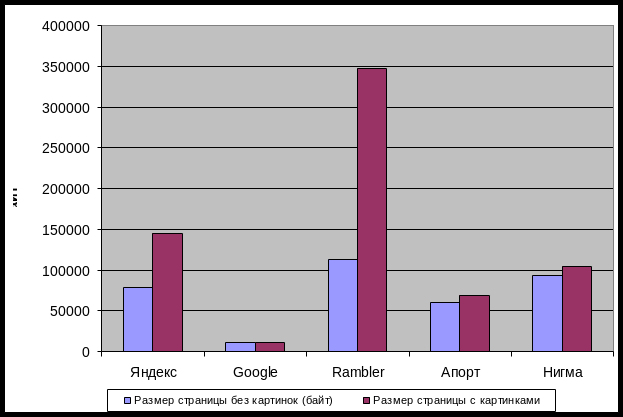 Наименьший размер страницы у Гугла, который составляет 10504 байт, это очень мало, по сравнению с лидером по величине страницы – Рамблером, размер главной страницы которого составляет 112926 байт без загрузки картинок и 347356 байт с загрузкой картинок.