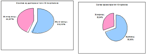 Рассматривая состав аудитории этих порталов, стоит отметить, что в целом мужская аудитория составляет немногим более половины. Однако в отношении просмотров страниц на них приходится почти 70% от всего количества. Средний мужчина совершает почти 80 просмотров страниц в месяц, тогда как женщина — чуть более 42. Среднее время также отличается в пользу мужчин: 1 час 22 минуты 34 секунды против 42 минут 46 секунд.