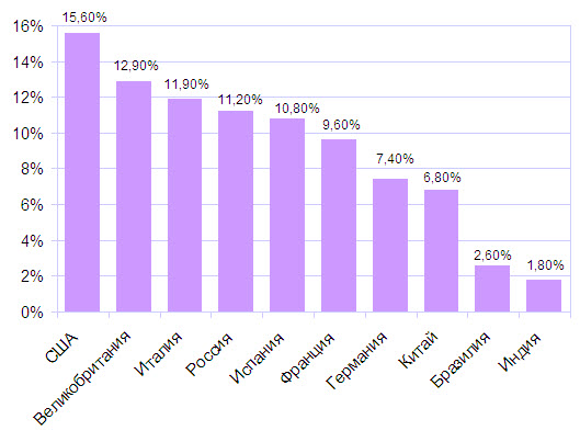 Мобильный Интернет продолжает завоёвывать популярность во всём мире. Россия в данном рейтинге входит в пятёрку лидеров: 11,2% пользователей мобильной связи в стране подключаются к Интернету со своих мобильных устройств.