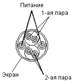 Стандартный кабель для IEEE-1394 состоит из 2 витых пар передачи сигналов шины, двух проводов питания и все это заключено в экранированную оболочку. Провода питания рассчитаны на ток до полутора ампер и напряжение от 8 до 40 вольт. На рисунке ниже показан один из вариантов кабеля IEEE-1394.