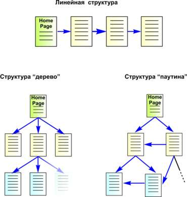 Особенно продуктивной идея гипертекста оказалась применительно к объединению цифровой информации, распределенной на серверах во всем мире. Документ, доступный через Web, называют Web-страницей, а группы страниц, связанных общим именем, темой и объединенных навигационно, - Web-сайтами. Первую страницу, которую видит пользователь при обращении на тот или иной ресурс, называют стартовой, домашней или индексной страницей (home page). Система гиперссылок определяет структуру Web-сайта. Страницы на сайте могут иметь линейную древовидную структуру, но чаще на каждой странице имеется несколько ссылок, что и позволяет говорить о структуре "паутина" (см. рис. 1)