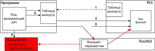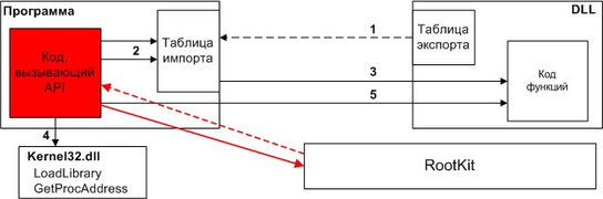 Описания методик перехвата функций снабжены схемами их работы, при этом красная пунктирная стрелка показывает вмешательство RootKit в процесс работы программы, красные стрелки показывают отклонения в логике работы, вызванные вмешательством RootKit.