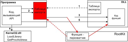 В данной методике модифицируется таблица импорта, причем в обязательном порядке перехватываются функции LoadLibrary и GetProcAddress библиотеки kernel32.dll. В этом случае при вызове статически импортируемых функций искаженные адреса берутся из таблицы импорта, при динамическом определении адреса вызывается перехваченная функция GetProcAddress, которая возвращает адреса функций-перехватчиков. В результате у программы не остается шансов узнать правильный адрес функции.