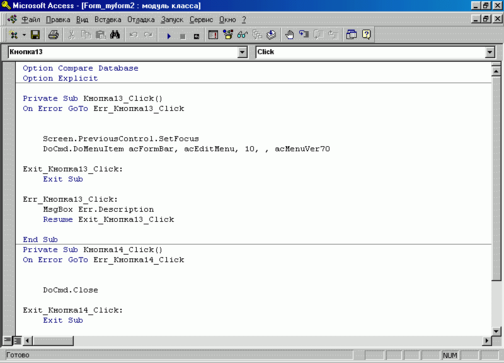Процедурою називається цілісна структурна одиниця коду на мові VBA. Кожна процедура складається з операторів, в яких застосовуються вбудовані в ACCESS 97 функції, методи і властивості, які призначені для виконання яких-небудь операцій над даними.