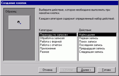 10. У списку Категорії вибрати пункт Переходи по записах, а потім в списку Дії - > Пошук запису. Після клацання на кнопці Готово у форму буде додана кнопка, що виконує пошук.