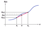 При линейной интерполяции выполняют аппроксимацию функциональных значений f (x) на промежутке (x1,x2) из известных значений f (x1) и f (x2).