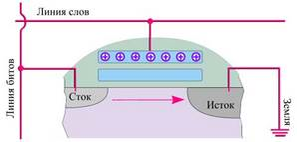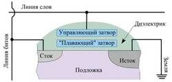 Таким образом, в самом простом случае ячейка Flash состоит из одного полевого транзистора. Элемент включает в себя специальную электрически изолированную область, называемую «плавающим затвором». Этот термин возник из–за того, что потенциал этой области не является стабильным, что позволяет накапливать в ней электроны (именно здесь и хранится вся информация памяти). Выше «плавающего» находится управляющий затвор, который является неотъемлемой частью при процессе записи/стирания данных памяти. Эта область напрямую соединена с линией слов. Перпендикулярно этой линии располагается линия битов, которая соединена со стоком (при записи данных из этой области транзистора появляется поток электронов). Сток разделяется с истоком специальной подложкой, которая не проводит электрический ток.