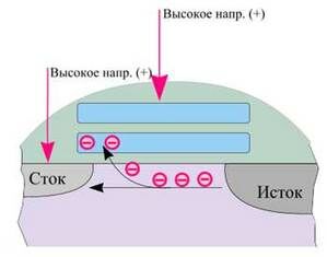| | При программировании на сток и управляющий затвор подаётся высокое напряжение (причём на управляющий затвор напряжение подаётся приблизительно в два раза выше). "Горячие" электроны из канала инжектируются на плавающий затвор и изменяют вольт-амперные характеристики транзистора. Такие электроны называют "горячими" за то, что обладают высокой энергией, достаточной для преодоления потенциального барьера, создаваемого тонкой плёнкой диэлектрика. |