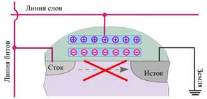 | Наличие заряда на "плавающем" затворе меняет вольт-амперные характеристики транзистора таким образом, что при обычном для чтения напряжении канал не появляется, и тока между истоком и стоком не возникает. | |
