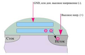 | При чтении, в отсутствие заряда на "плавающем" затворе, под воздействием положительного поля на управляющем затворе, образуется n-канал в подложке между истоком и стоком, и возникает ток. | |