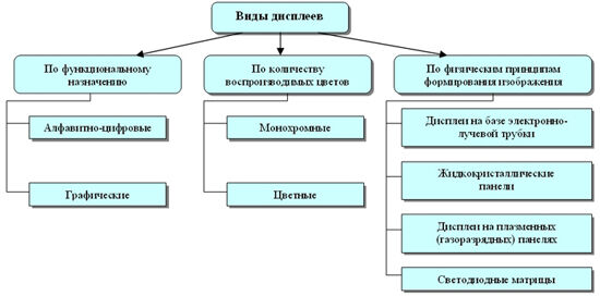 Принцип работы. Так как информация бывает разной, то используются разнообразные устройства отображения информации. Краткая классификация дисплеев приведена на рисунке.