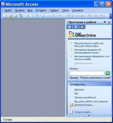 После загрузки MS Access на экране появится главное окно, в котором размещается окно базы данных. При первом запуске Access в главном окне выводится область задач в режиме «Приступая к работе», с помощью которой можно открыть существующие БД и «Создать файл».