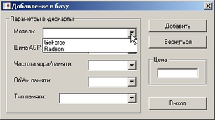 Добавление происходит с помощью 4 – х элементов combobox и одного textbox. Если в форму ничего не введено то появляется окно "Введите модель видеокарты".