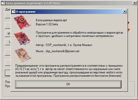 - База данных имеет кроме файла с информацией о видеокартах (.dat) файлы с произвольным доступом. Файл настроек хранит информацию о положении флажков и количестве действий в истории. Файл истории хранит все сведения истории.