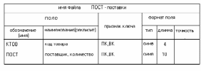 Для каждого поля задается сокращенное обозначение – имя поля, формат поля – тип хранимого данного, длина поля и точность числовых данных.