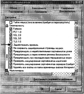 Откройте диалоговое окно Свойства обозревателя (Internet Ехр1огег > Сервис > Свойства обозревателя). Открой вкладку Дополнительно. В разделе Безопасность сбрось галочку Задействовать профиль. Если флажок оставить, браузер будет поставлять удаленным серверам по их запросу личные данные о пользователе (см. рис. 1).