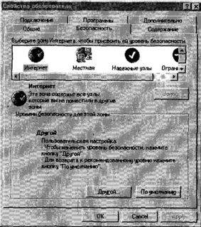 Элементы управления, связанные с настройкой правил безопасности, сосредоточены на вкладках Дополнительно и Безопасность диалогового окна Свойства обозревателя (см. рис. 1).