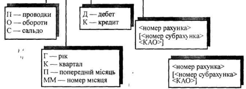 Як змінні в розрахункових формулах використовуються проводки по рахунках, обороти і сальдо по рахунку. Структура найменувань змінних строго визначена і має такий вигляд (Рис. 2. Квадратними дужками виділені необов'язкові компоненти):