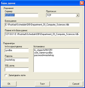 Вхідними даними для програми "Schedule" є дані, що зберігаються в базі даних (Рис.6.16) і параметри розкладу (Рис.6.13), програми (Рис.6.14) та бази даних (Рис.6.15), які зберігаються в системному реєстрі. При наявності файлів із збереженим розкладом вони також можуть виступати в ролі вхідних даних. База даних працює під керуванням СКБД FireBird 1.5, встановленої на серверній машині, що має зв’язок по мережі з клієнтською машиною, на якій знаходиться програма. Остання надає можливість змінювати, додавати та видаляти будь-які з вказаних даних за допомогою відповідної кількості непов’язаних між собою екранних форм, що дозволяє користувачеві порівнювати та оцінювати одночасно декілька блоків даних.