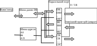 Фактично паралельний порт складається з трьох 8-бітних портів/ регіcтрів: