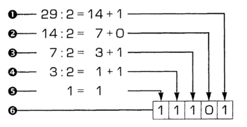 6. Смотрим на результат. У нас получилось двоичное число 11101 — это и есть двоичный код числа 29.