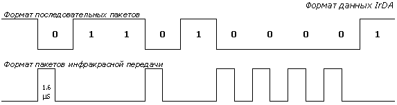 Передающая часть. Байт, который требуется передать, посылается в блок UART из CPU командой записи ввода-вывода. UART добавляет старт-стоп биты и передает символ последовательно, начиная с младшего значения бита. Стандарт IrDA требует, чтобы все последовательные биты кодировались таким образом: логический "0" передается одиночным ИК-импульсом длиной от 1.6 s до 3/16 периода передачи битовой ячейки, а логическая "1" передается как отсутствие ИК-импульса. Минимальная мощность потребления гарантируется при фиксированной длине импульса 1.6 s.