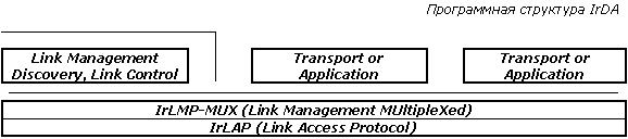 Он включает в себя: IrLAP (Link Access Protocol), занимающийся разбиением данных на блоки, контролем ошибок и другими функциями низкого уровня, и IrLMP (Link Management Protocol), позволяющий по одной ИК-линии обмениваться данными между несколькими приложениями. Данный протокол базируется на существующих стандартах асинхронной полудуплексной передачи данных HDLC и SDLC. Инфракрасная технология поддерживает только однонаправленную передачу информации, поэтому, в следствие полудуплексной природы SIR, возникла архитектура с одним главным (первичным) и множественными подчиненными (вторичными) устройствами. Схема обращения устройств представляет собой обычный протокол обмена данными, где есть фазы запросов (Request) и ответов (Response). Так, первичное устройство отвечает за организацию соединения, обработку ошибок, и посланные им фреймы называются управляющими (Command Frames), а пакеты вторичных устройств именуются ответными (Response Frames). Обмен информацией идет только с первичным устройством, которое всегда выступает инициатором соединения, однако его роль может играть любое из устройств, поддерживающих необходимые для этого функции. По желанию может быть включен протокол транспортного уровня, позволяющий осуществлять контроль передачи между приложениями в случае одновременной работы нескольких приложений на одной физической линии. Для разных уровней имеется три интерфейса. Служебные примитивы уровня LM-SVC позволяют одному из устройств IrDA узнать какие сервис и протоколы зарегистрированы на другом устройстве. Примитивы доступа к уровню M-SVC управляют режимом связи, открытием и закрытием независимых соединений между клиентами, а так же отправкой и приемом данных. Интерфейс L-SVC дает доступ к функциям протокола IrLAP.