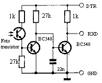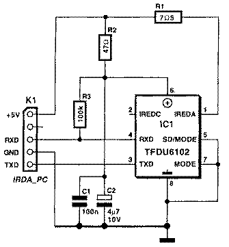 Если требуется только прием IrDA, то предлагается схема простейшего IrDA приемника (рис.2), выполненного на дешевых распространенных элементах. Оно питается прямо от ПК и обеспечивает дальность приема от стандартного IrDA передатчика всего на несколько десятков см, но этого в большинстве случаев оказывается достаточно.