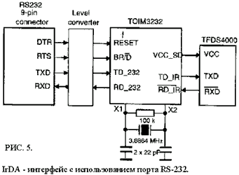RS-232. Во многих схемах бывает необходимо и удобно организовать ИК-связь через последовательный порт RS-232. В этих случаях, для кодировки сигнала в соответствии с IrDA-стандартом, используются два элемента: конвертер уровней RS-232 (например, MAX232, HIN232 и т.п.) и, собственно, микросхема кодировки сигнала: HSDL-7000, HSDL-7001 (Agilent Technologies), TOIM3232 (Vishay). (Рис. 5).