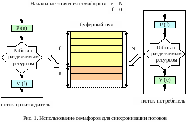 Введем два семафора: е — число пустых буферов, и f — число заполненных буферов, причем в исходном состоянии е = N, a f = 0. Тогда работа потоков с общим буферным пулом может быть описана следующим образом (рис.1).