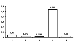 Рис. 1. Вероятность появления ошибочного пакета на канале Калининград - Москва: 1 - 3 - прогнозируемая вероятность появления ошибочного пакета при длинах 1024, 512, 256 и менее соответственно, 4 - реальная вероятность ошибочного пакета, 5 - реальная вероятность ошибочного пакета после настройки АПД