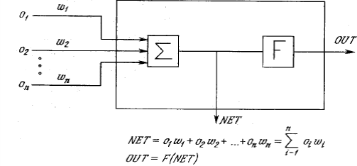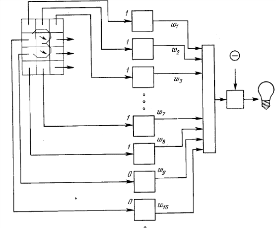 К середине 50-х годов казалось, что нейрофизиологами были поняты физические принципы работы мозга (в книге "Новый Разум Короля" знаменитый британский физик-теоретик Р. Пенроуз интересно ставит под сомнение нейросетевую модель мозга, обосновывая существенную роль в его функционировании квантово-механических эффектов; хотя, впрочем, эта модель подвергалась сомнению с самого начала. Отталкиваясь от этих открытий Ф.Розенблатт разработал модель обучения распознаванию зрительных образов, названную им персептроном. Персептрон Розенблатта представляет собой следующую функцию (рис. 1) [6, c. 41]: