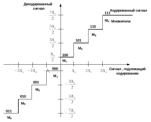 оказываются допустимыми значительно большие искажения сообщения, чем в области малых мгновенных значений, требуемое число уровней квантования может быть существенно снижено путем использования неравномерного квантования, используя компрессию исходного сообщения по логарифмическому закону с последующим равномерным квантованием при сравнительно малом числе уровней (например, при