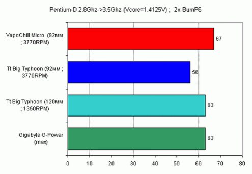 Напротив, кулер Thermaltake Big Typhoon, в штатном бесшумном режиме, смог без особых проблем охладить тестовый процессор. А когда мы заменили вентилятор на более производительный 92мм от кулера VapoChill Micro, то получили выигрыш в несколько градусов.
