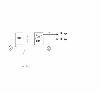 На рис. показана схема двоичного переключателя. Когда на кристалл падает линейно поляризованный свет, плоскость поляризации которого совпадает с плоскостью поляризации О - луча (приложенное к электрооптическому кристаллу ЭОК напряжение равно нулю), - переключатель открыт. В этом случае свет через кристалл кальцита КДП проходит не отклоняясь, а точка выхода света соответствует точке выхода О - луча. Если к ЭОК приложено напряжение U , то переключатель закрыт, падающий О - луч превращается в H - луч, свет распространяется по пути, соответствующему пути H - луча. Комбинация ЭОК и КДП представляет собой двоичное электрооптическое устройство управления положением светового луча.