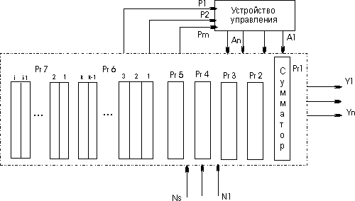 Закон переработки информации задает микропрограмма , которая записывается в виде последовательности микрокоманд A1,A2, ..., Аn-1,An. При этом различают два вида микрокоманд: внешние, то есть такие микрокоманды, которые поступают в АЛУ от внешних источников и вызывают в нем те или иные преобразования информации (на рис. 1 микрокоманды A1,A2,..., Аn), и внутренние, которые генерируются в АЛУ и воздействуют на микропрограммное устройство, изменяя естественный порядок следования микрокоманд. Например, АЛУ может генерировать признаки в зависимости от результата вычислений: признак переполнения, признак отрицательного числа, признак равенства 0 всех разрядов числа др. На рис. 1 эти микрокоманды обозначены р1, p2,..., рm.