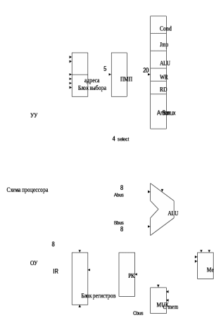 Синтезировать структуру простого магистрального процессора с одним АЛУ, выполняющего 8 заданных команд. Разработать формат команд, кодировку команд. Разработать структурную схему процессора, функциональные схемы всех блоков процессора, функциональную схему процессора в целом с указанием всех шин и управляющих сигналов.