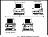 В данном случае кабель используется совместно всеми станциями по очереди. Принимаются специальные меры для того, чтобы при работе с общим кабелем компьютеры не мешали друг другу передавать и принимать данные.