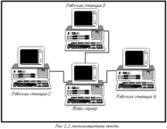 2. При топологии «звезда» все компьютеры с помощью сегментов кабеля подключаются к центральному компоненту, именуемому концентратором (HUB). На рисунке 1.3 показаны компьютеры, соединенные «звездой». В этом случае каждый компьютер через специальный сетевой адаптер подключается отдельным кабелем к объединяющему устройству.